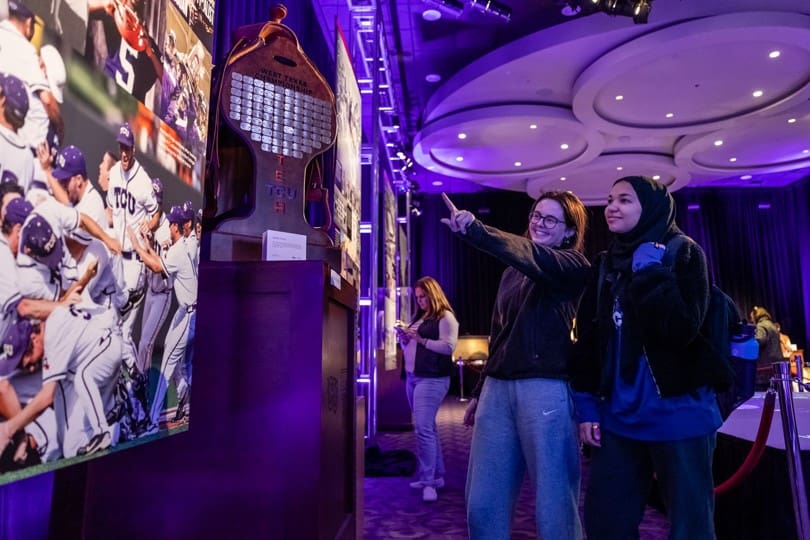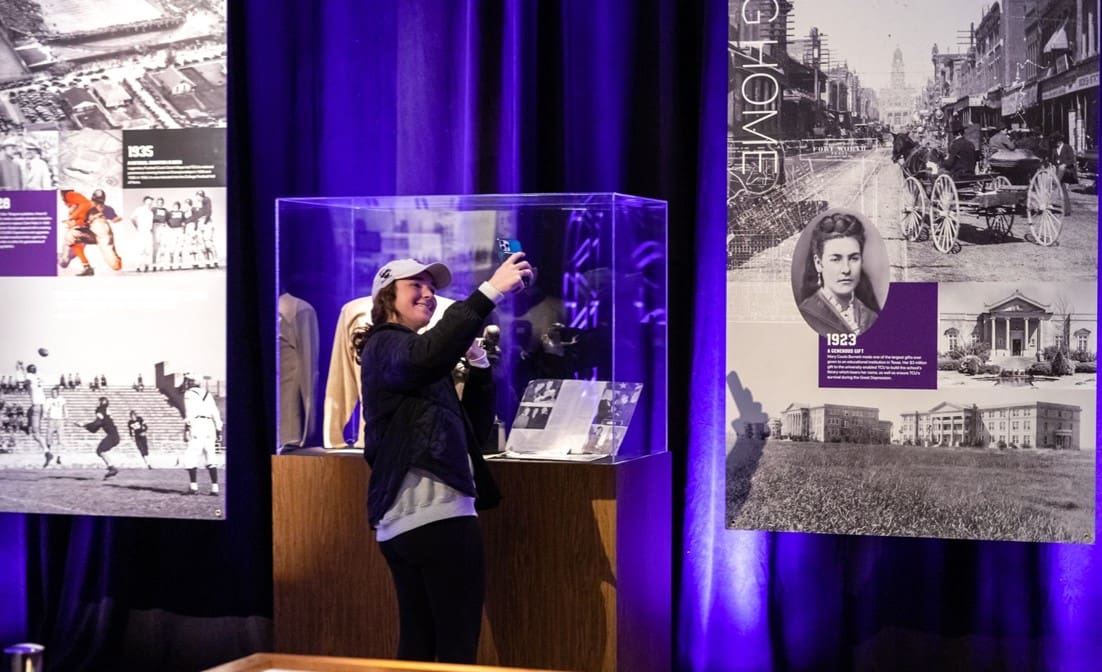 To support the year’s work was a bold undertaking—a four-day immersive, on-campus exhibit tracing TCU’s remarkable past, present and the future it is destined to lead. Dubbed The Story of Us, this immersive exhibit filled a giant campus ballroom wall-to-wall with historic imagery, videos, memorabilia and interactive digital touch points.