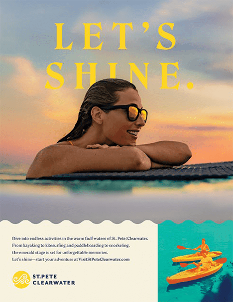 The vibrancy platform is creatively expressed as Let’s Shine. St. Pete-Clearwater averages 351 days of sunshine each year and a year-round average temperature of 81 degrees. It’s a destination where every visit is vibrant and rejuvenating. Every color is more vivid, every sip more flavorful, every smell more intoxicating, every touch more intense. Every moment more memorable. “Let’s Shine” encourages travelers to make the most out of every visit and escape to Visit St. Pete-Clearwater.